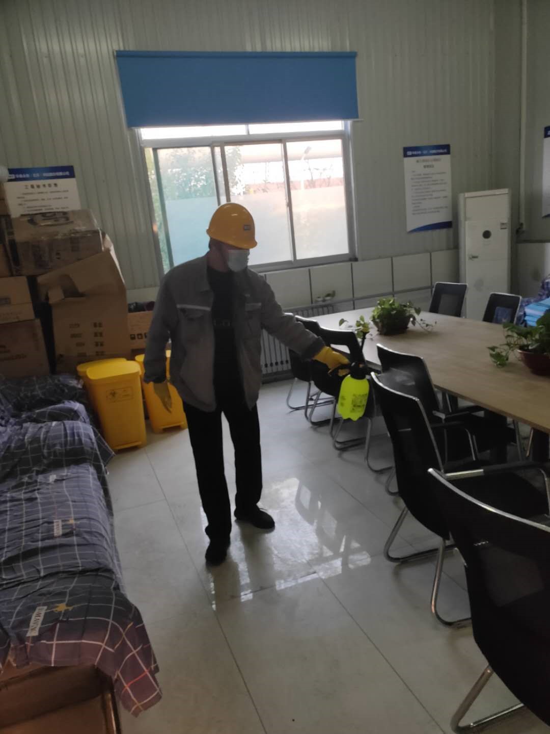 河北乐亭项目部:该项目位于河北唐山,疫情发生以来,京津冀一直是疫情防控的重点,导致其复工难度很大,河北乐亭项目部为了早日复工默默地努力着。项目经理李金海提前制定复工预案,主动向业主方报备,提前前往项目所在地隔离,项目复工以来,每日对整个办公区域定时消毒,严格执行出入人员登记、测温制度,为现场施工安全及疫情防控把好第一道关。