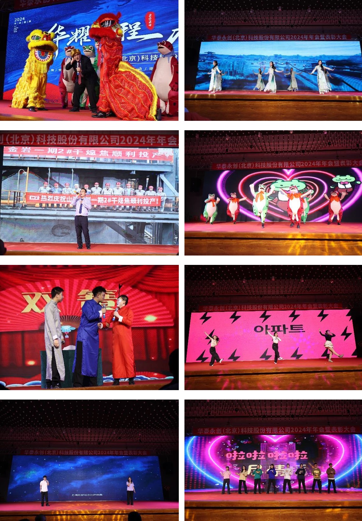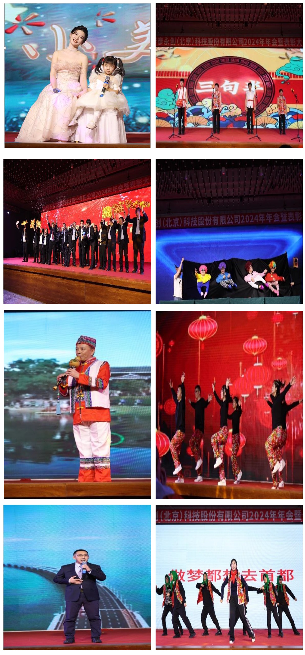 今年的联欢会更胜以往,每一项都那么的经典出众。舞蹈《Trouble maker》(表演者:郭天赐、孙宇、孟德鑫、刘馨月、杜建、王磊),一套套青蛙的着装,加上可爱的舞蹈动作,让大家放松了心神,年轻了岁月。双簧《哥俩一条心》(表演者:肖思彤、张石、张博尹)更是带给大家无限的乐趣,演员画脸后的样貌,更引得大家一片叫好。舞蹈《APT》(表演者:刘南冰、杨艺、杨月峰)尽展了华泰年轻女员工的魅力四射,激情无限。一首《稻香》(演唱者:栾鑫、曹博文)以嘻哈和民谣混奏,以轻快的节奏激励着困境中的人要鼓起勇气,勇于走向未来。展现了华泰人的斗志,将大家代入灵动的旋律中,回味无穷。舞蹈《青苹果乐园》(表演者:唐锦程、黄天宇、王瑞雪、信佳慧、刘兴艳、徐春宜),欢快的舞姿,展现着华泰员工不乏阳光四射、活力无限的魅力。歌曲《小美满》(演唱者:崔芙嘉、孙秀茁女儿),人物初登场便带给大家无限遐想,心随而动,正如歌曲小美满、小确幸。小品《三句半》(表演者:张伟亮、刘峰赫、战帅、张博尹)的滑稽与风趣带给大家无限欢笑和乐趣。歌舞《中年敬业阵线联盟》(表演者:袁晓安、孙兴盛、张宏全、马家峰、宋闯、卢翠玉、张建斐、孙宏宇、李雪冰、闫振、赵月、代丽、魏巍、吴纯旭、张泽宇、李鑫、于鹏飞、胡海鸥、杜泉坤),诉说着中年人不敢落后联盟登台,伴着熟悉的旋律,展现出拼劲依旧在,未曾退出舞台的坚韧和拼搏情怀。舞蹈《小人舞》(表演者:肖思彤、张博尹、张石、徐浩海、栾雯、于洁、张文鑫、刘峰赫、栾斌、战帅)更具奇思妙想,其动感音乐和可爱的动作,给大家带来了新奇的乐趣。葫芦丝独奏《侗乡之夜》(演奏者:付永顺),其宁静、祥和的旋律让大家感受着这饱含侗族人深厚情怀的宁静之夜。